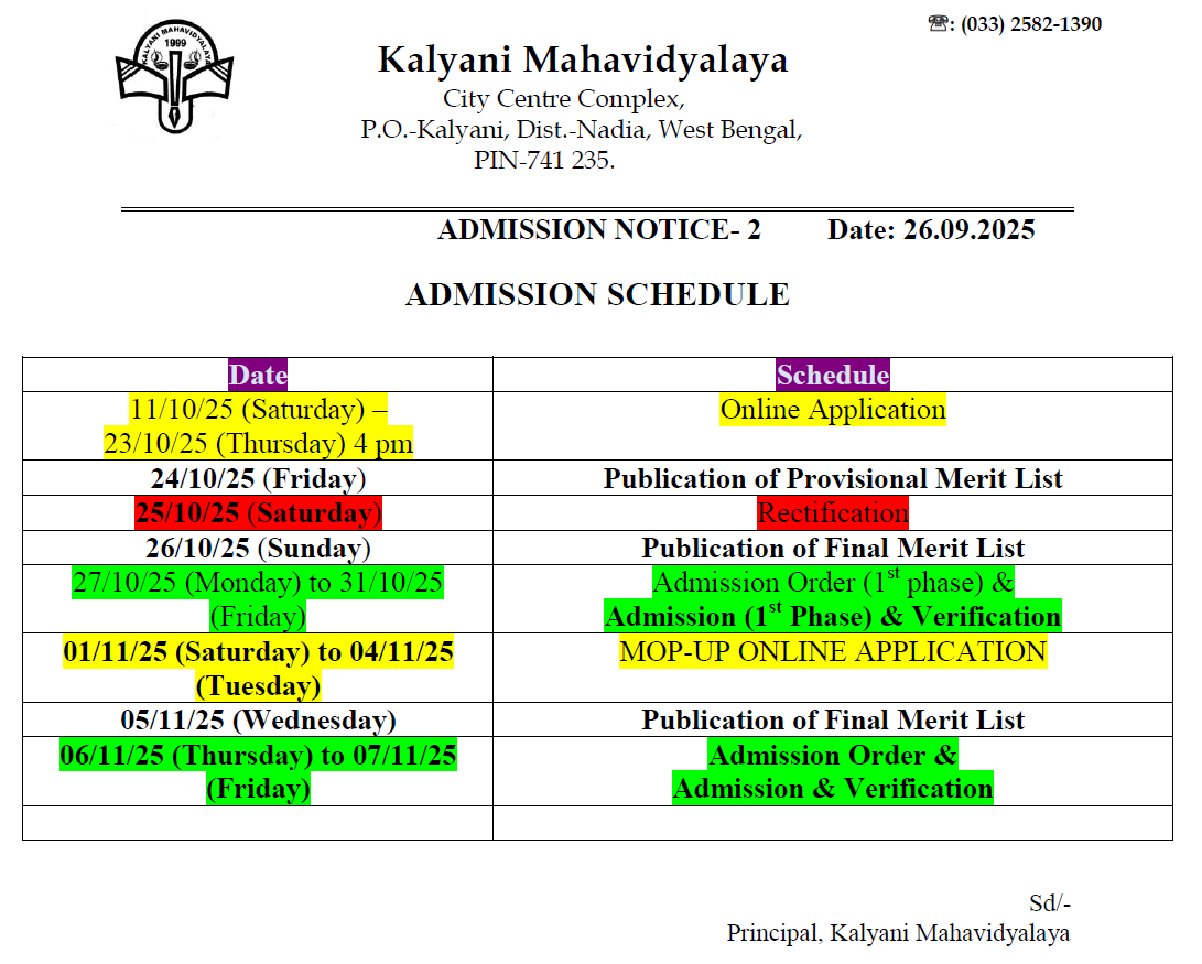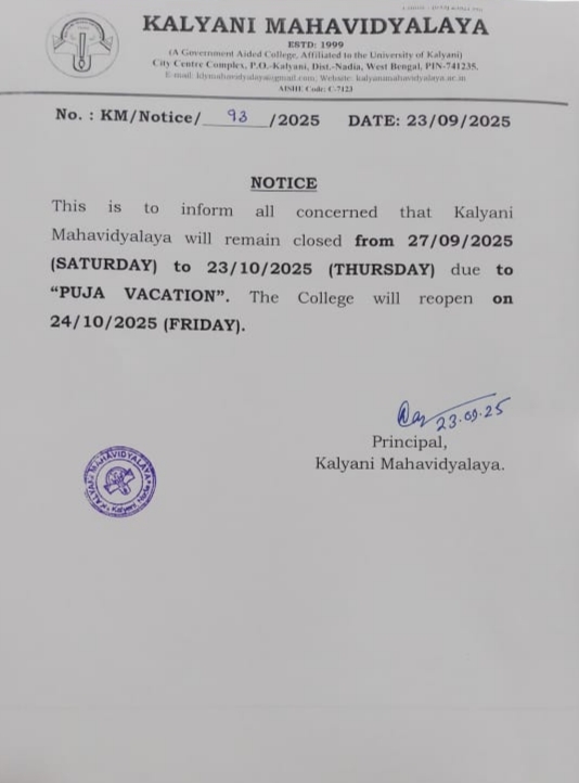 Kalyani was established in 1999 as a satellite Town about 48 kilometers north of Kolkata. Designed to become an educational and industrial hub, Kalyani was affectionately called the dream-child of Dr. Bidhan Chandra Roy, the then Chief Minister of West Bengal. Though two Universities, two engineering colleges and a good number of regional and state level institutions and a number of excellent schools are located in Kalyani, there was no degree college in the town. Kalyani Mahavidyalaya was established in 1999 to cater not only to the needs of Kalyani, but also the vast areas in Nadia, Hooghly and North 24 Parganas.