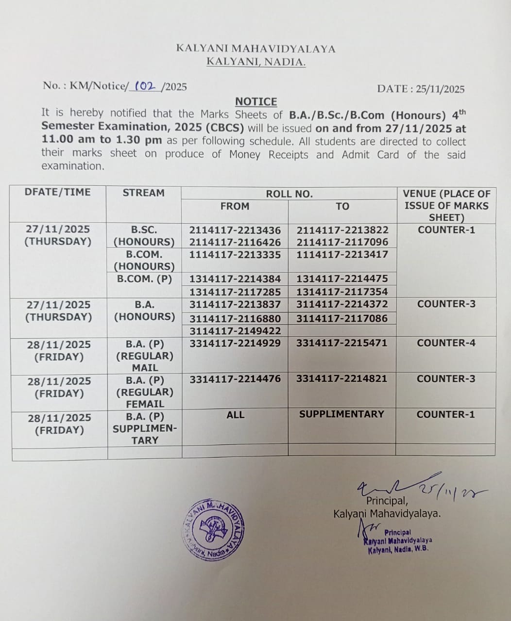 The first batch of students graduated from the college in 2002 with flying colours. Inspite of being the youngest college in terms of age, almost all the departments had students who were placed in the merit list of the University of Kalyani. Since then the college has effortlessly maintained its excellent academic record not only among the colleges affiliated to the University of Kalyani but also among the rest of the colleges in West Bengal.